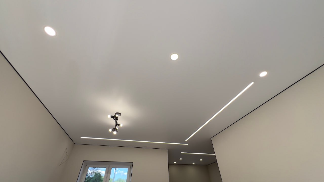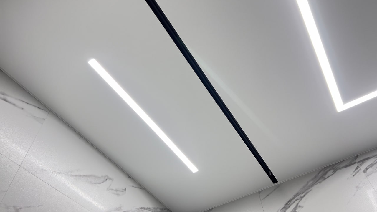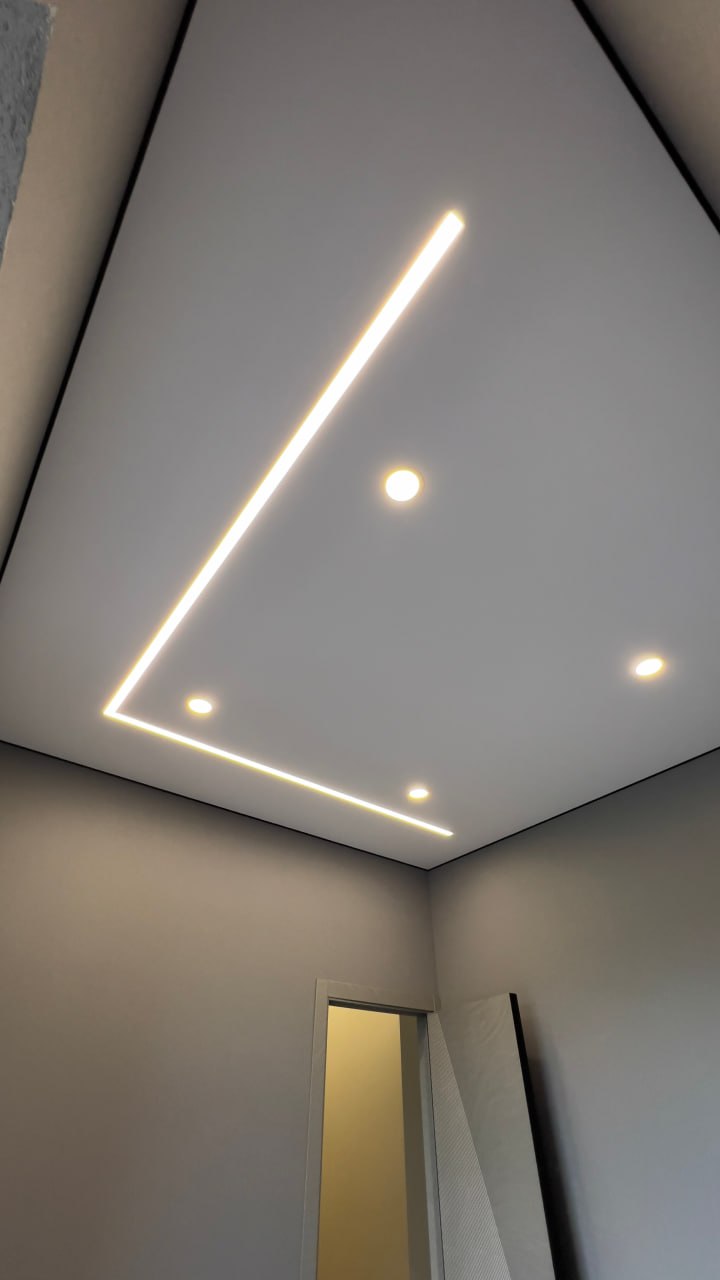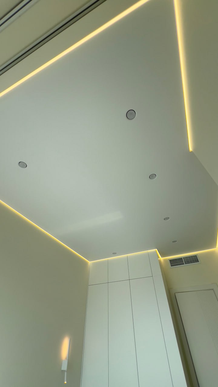Сделали контурный натяжной потолок - выглядит круто. Рассматривали и теневой натяжной потолок, но в итоге выбрали контурном. Качество работы шикарное, потолок эффектный, интерьер сразу стал выглядеть дороже.