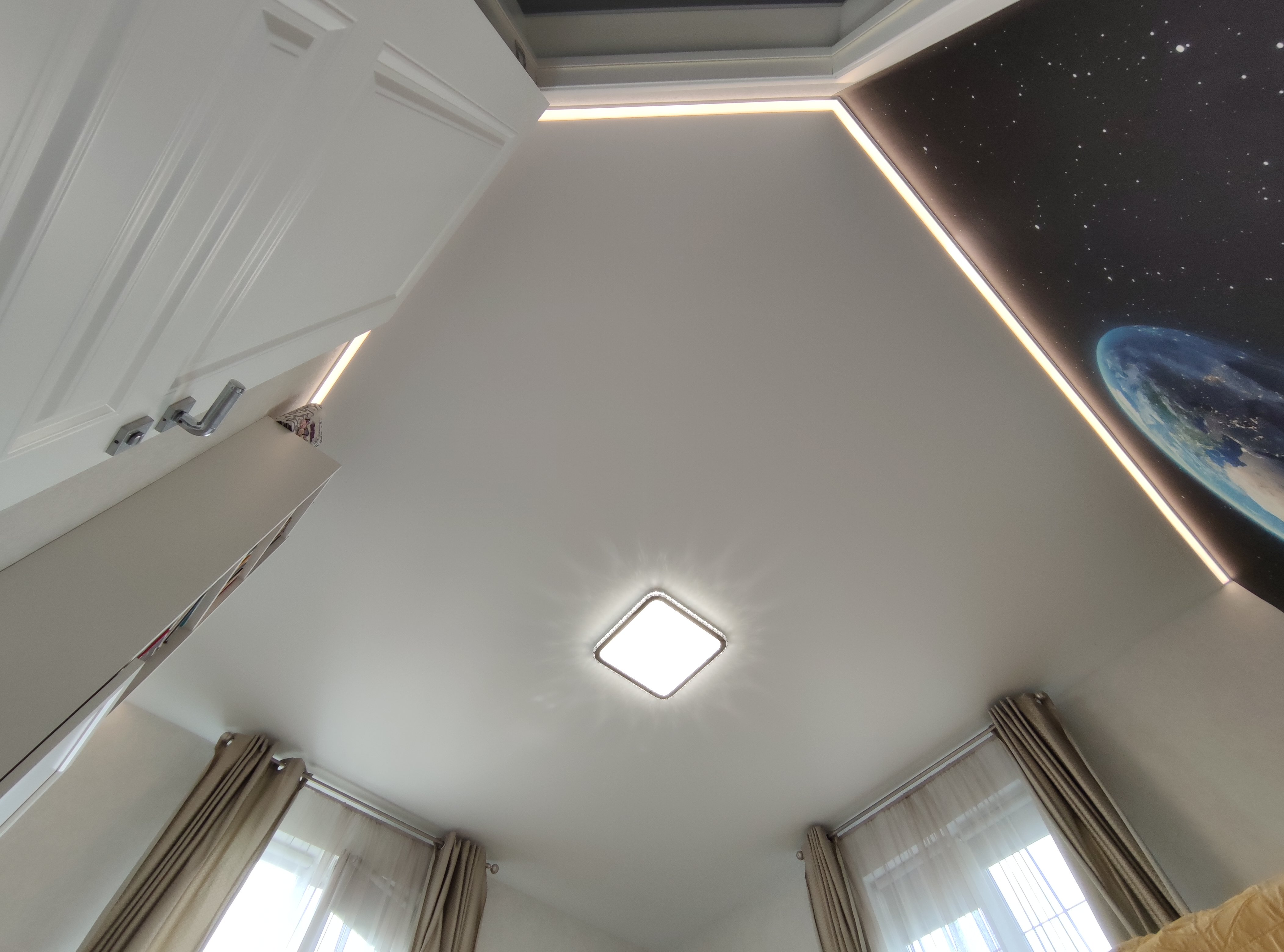 Натяжной потолок с контурной подсветкой — оригинальное решение для спален и гостиных. Они создают красивый световой эффект и уютную, спокойную атмосферу. Заказать потолочную систему с подсветкой по периметру комнаты в Дедовске по доступной цене можно в нашей компании «Седьмое небо».