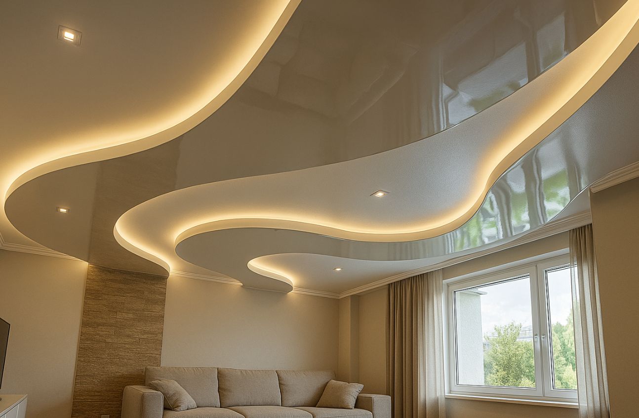 - Многоуровневые потолки — конструкции с двумя и более уровнями (ярусами).